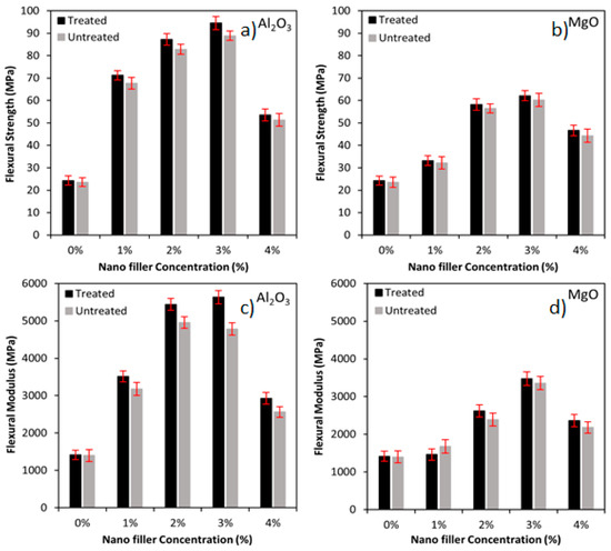 In the case of nano-MgO, the flexural strength and modulus of the treated biotex flax/PLA in the presence of nano-MgO (1–3%) increased by approximately 36%, 140% and 156% as compared to untreated, which has 36%, 140% and 156%, respectively. The modulus of the treated reinforcement was increased by 3%, 85% and 146% as compared to untreated, which has 20%, 71% and 140%, respectively compared to the neat sample (0% of nano-MgO). Further increase in the nanofiller concentration to 4% reduced the flexural strength by 25% (treated) and 26% (untreated), and the modulus by 32% (treated) and 35% (untreated), respectively when compared with the sample with 3% of nano-MgO, as shown in Figure 3b,d. This decrease is due to nano-MgO aggregation, which negatively impacts the mechanical and physical properties of the fabricated nanocomposites, with similar results reported in glass/SiO2/epoxy [31] and luffa/PbO/epoxy [52].