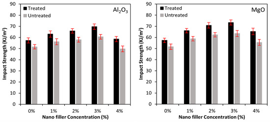 In the case of nano-MgO, the impact strength of the treated biotex flax/PLA in the presence of nano-MgO (1–3%) increased by approximately 15%, 24% and 28% as compared to untreated, which has 14%, 21% and 23%, respectively, as compared to the neat sample (0% of nano-MgO). Furthermore, an increase in the nanofiller concentration to 4% decreased the impact strength by 11% (treated) and 13% (untreated), concerning the sample having 3% nano-MgO. The presence of Al2O3 and MgO nanofiller in the epoxy matrix generates matrix discontinuity, which provides sites for crack initiation, resulting in decreased impact strength at 4% nanofillers; similar results are reported in bagasse/SiO2/PE [37] and PLA/nanoclay/LLDE [64].