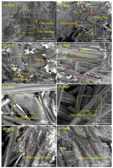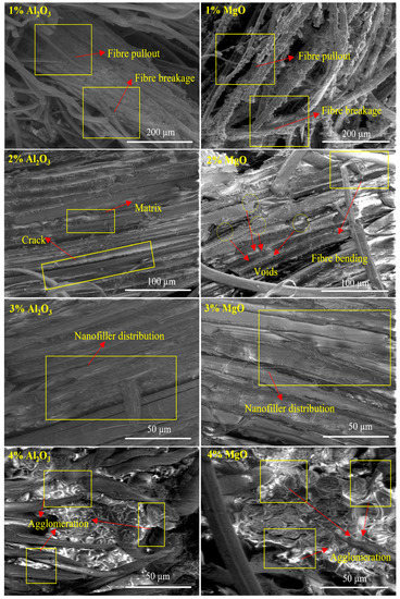 However, this interface is better than that of the neat composite. As the amount of nanofiller in the matrix increases, the fibre–matrix interface improves. Better fibre–matrix bonding was observed when the matrix contained 2% and 3% nanofiller. Minimum fibre pullout indicates improved fibre–matrix interfacial adhesion; this aids in transferring load from the matrix to the fibre, thereby increasing its strength. The decrease in mechanical properties caused by the aggregation of nanofiller at 4% is also justified by the micrograph images, which restrict the interaction of the nanofiller with the matrix, resulting in the laminates’ poor mechanical properties. The same trend was observed in micrograph images (as shown in Figure 8) of untreated biotex flax/PLA reinforced epoxy composites with nanofiller Al2O3 and MgO at concentrations ranging from 1% to 4%. Similar SEM images are also analyzed for oil palm nanofiller/kenaf fibre/epoxy hybrid nanocomposites [1] and lead oxide nanofiller/luffa fibre/epoxy hybrid nanocomposites [52].
