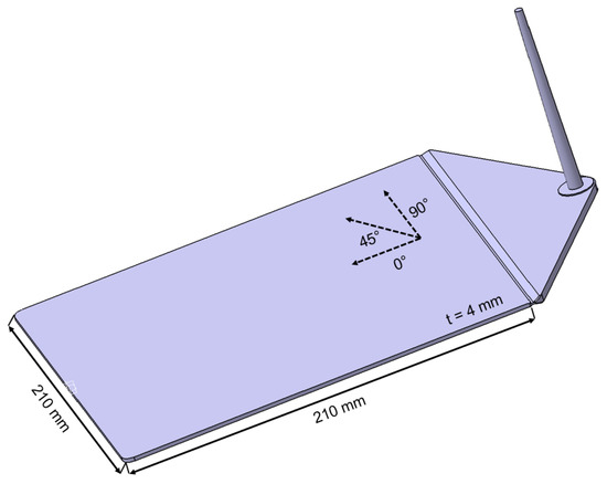 An industrial injection molding machine with a maximum clamping force of 200 t (KM200-1000C2, KraussMaffei, Munich, Germany) was used for the experimental processing tests and its influence to the anisotropic mechanical properties of the short glass fiber-reinforced thermoplastic (see Table 3). Thus, test plates with the dimensions of 210 mm × 210 mm × 4 mm were produced from the PP/GF30 compound with a melt temperature of 230 °C and a mold temperature of 40 °C. To investigate the influence of the flow profiles and the corresponding shear stresses on the resulting mechanical properties, the experiments were carried out by varying the volume flow rate between 25, 50 and 100 cm3/s. The subsequent analysis of the samples was carried out by means of fiber length and fiber orientation analysis as well as tensile testing of standard test specimens machined out in 0°, 45° and 90° related to the flow direction, as shown in Figure 1. In result, nine different sets of test specimens were analyzed regarding their mechanical properties. Labeling of those sets can be found in Table 3. Additionally, test structures with the geometry shown in Figure 2 were made of the hybrid injection molded thermoplastic composites for comparative experimental and numerical investigations.