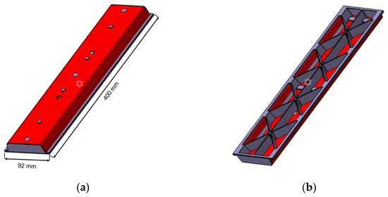 Geometry of the hybrid injection molded thermoplastic composite bending test structure with the PP/GF60 continuous fiber-reinforced thermoplastic composite in red and the PP/GF30 short fiber-reinforced thermoplastic composite in grey: (a) top and (b) bottom.