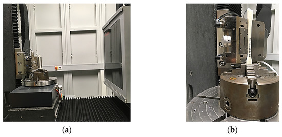 Experimental set up used for fiber orientation analysis of the PP/GF30 short fiber-reinforced thermoplastic composite: (a) computed tomography system and (b) test specimen clamped on turntable.