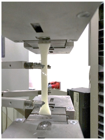 Investigation of the anisotropic mechanical properties of the injection molded test plates of the PP/GF30 compound was carried out by tensile tests on machined out 1A test specimens according to ISO 527 at 24.5 °C with a universal test machine (Z050, Zwick Roell, Ulm, Germany) as shown in Figure 5. The measurement of the tensile modulus was carried out at 1 mm/min test speed, while the tensile strength was tested at 10 mm/min. The test specimens were machined out from the injection molded test plates in 0°, 45° and 90° related to the flow direction.