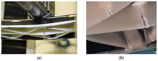 Three-point flexural test of the PP/GF60 and PP/GF30 hybrid injection molded thermoplastic composite test structure: (a) test set-up and (b) failure of ribs as a result of the bending load.