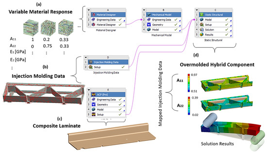 Workflow of the multiscale model in ANSYS Mechanical using the Material Designer (MD): (a) creation of the material response as a function of the microstructure by an interpolation grid with attached elastic and plastic parameters, (b) import of injection molding data, i.e., the second order orientations tensors from the injection molding software, (c) modeling of the ply-based continuous fiber-reinforced TPC laminate and (d) mapping of the injection molding data to the short fiber-reinforced parts and bonding to the continuous fiber-reinforced laminate.