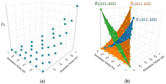 Visualization of the properties of generated variable material response with respect to the axes of principal orientations: (a) interpolation grid for E1 and (b) interpolation grids and interpolation surfaces for E1, E2 and E3 as functions of principal orientations A11 and A22. The user is given the possibility to generate analogous plots for the other 6 homogenized elastic parameters of the orthotropic behavior in the coordinate system defined by the principal axes of 2nd order orientation tensors.