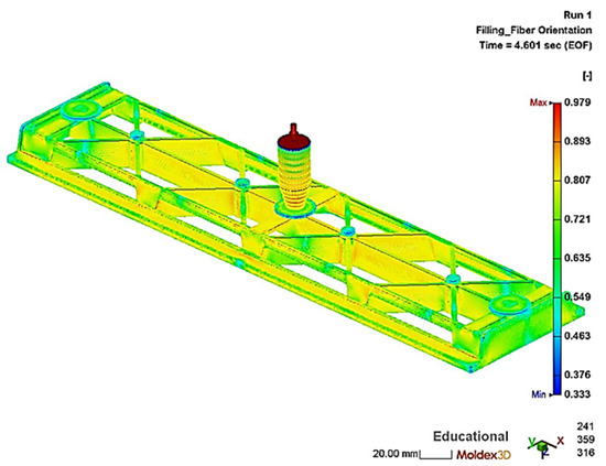 The simulations of the injection molding process with a flow speed of 50 cm3/s were evaluated with regard to the resulting fiber orientation and length depending on the simulation parameters. The fiber orientation corresponds to the distribution of the fiber orientation vector of the plastic melt at the end of the packing step and can be seen in Figure 9 for the hybrid injection molded structure. In here, a value of 0.33 means that the orientation of the fibers is random and a value of 1 means that the fibers are 100% oriented in the flow direction. The obtained data of the hybrid injection molding simulation was imported into ANSYS Workbench (ANSYS 2021R1, Ansys Inc., Canonsburg, PA, USA) for structural analysis. Additionally, experimental validation of the simulated local fiber length and orientation for the test plates was carried out.