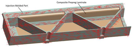 Main fiber directions of the PP/GF30 short fiber-reinforced thermoplastic composite mapped to the meshed geometry of the test bending structure using the orientation tensor output from the injection molding simulation. The injection molded part is directly bonded to the continuous fiber-reinforced laminate using contact elements.