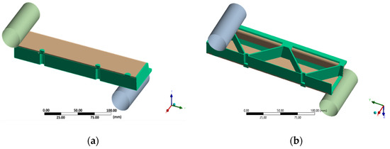 Quarter model of the three-point flexural test of the hybrid injection molded thermoplastic composite test structure. The injection molded PP/GF30 short fiber-reinforced thermoplastic composite is shown in green and the PP/GF60 continuous fiber-reinforced thermoplastic composite in brown: (a) top view and (b) bottom view.