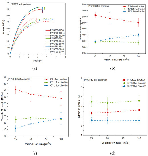 The results of the tensile tests of the PP/GF30 short fiber-reinforced thermoplastic composite material are shown in Figure 13. Anisotropic and inhomogeneous behavior of the material was found, depending on the volume flow rate and direction during the injection molding process of the test plates. This can be seen in the stress-strain-curves of the test specimen cut out in the different directions (Figure 13a). The highest stiffness and strength were measured in flow direction, while these properties are decreasing with volume flow rate, which can be seen in Figure 13b,c. It is also shown that the opposite trend was found perpendicular to the flow direction, while no significant influence of the flow rate on the stiffness and strength in 45° to the flow direction was found. However, in this direction the highest strain at break was measured, without any significant influence of the flow rate, as shown in Figure 13d. These trends correlate to the flow rate dependent short fiber orientation mechanisms during injection molding as published by Bay and Tucker III [35,36]. As reported by Oumer and Mamat [37], at low flow rates the short fibers are more oriented in the flow direction and therefore the stiffness and strength of the composite are higher in this direction. Given the results shown in Figure 13, the same mechanism has to be stated for the PP/GF30 short fiber-reinforced composite material used in this study.