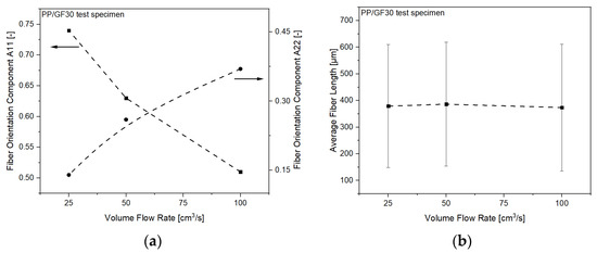 To validate this effect, CT measurements of the fiber orientation in the processed PP/GF30 short fiber-reinforced thermoplastic composite test samples have been analyzed. The measured fiber orientation components A11 and A22 of the composites are shown in Figure 14a. It can be seen that the A11 orientation component is decreasing with increasing flow rate, while the opposite trend is shown for the A22 component. This clearly indicates the flow rate dependent fiber orientation and resulting anisotropic mechanical behavior. As reported by Huang and Lai [38], this can be attributed to a flow-fiber coupling effect, diminishing the flow direction orientation tensor component A11 and simultaneously enhancing the cross-flow orientation tensor component A22. However, no influence of the flow rate on the average fiber length was found, as shown in Figure 14b. Numerical simulation of such fiber orientation mechanisms has been studied and significant theoretical orientation models have been developed, including RSC (Reduced Strain Closure), ARD (Anisotropic Rotary Diffusion), and iARD-RPR (improved ARD and Retarding Principal Rate) [39,40,41]. They have been widely applied in commercial injection molding simulation software such as Moldex3D or Moldflow, with good agreement between the predictions and the experimental data obtained.