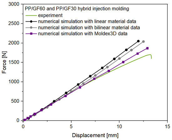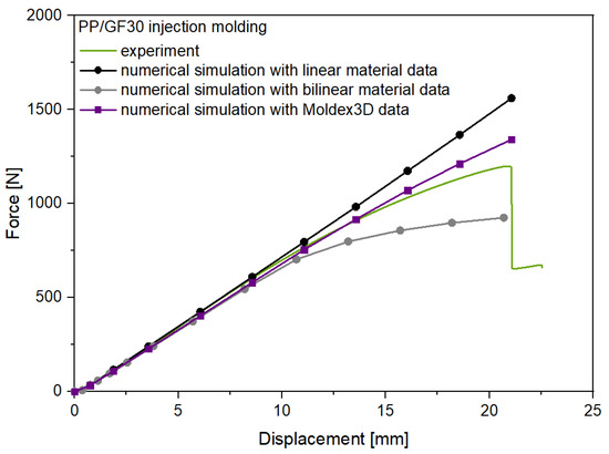 The experimental and numerical results for the flexural test of the PP/GF30 short fiber-reinforced thermoplastic composite test structure are shown in Figure 15. As can be seen, the experimental force-displacement curve is showing nonlinear behavior after a displacement of 10 mm. These experimental results are compared to the three different structural analysis carried out with linear, bilinear and injection molding simulation data (Moldex3D) to investigate the effect of the precise consideration of the anisotropic mechanical behavior. For the structural analysis with the linear and bilinear material approach no fiber orientation information were added from the injection molding simulation.