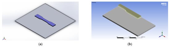 The model selected for Finite Element Analysis and 3D printing is the standard sample for tensile testing along with the build platform, as shown in Figure 1a. The build platform having dimensions equal to those in the actual printer was added to the analysis to represent the heat transfer through the bottom layer more accurately. The part was selected as it is long and thin, which allows obtaining larger warpage and facilitates the measurements.
