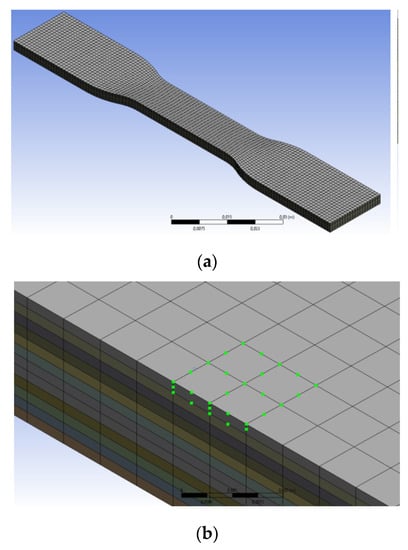 To discretize the model, the structured hex mesh was used, as shown in Figure 3a. The order of the mesh is two, meaning that there is a mid-side node on each edge of an element, as shown in Figure 3b. This allows using second-order shape functions, alleviates shear locking, and increases the accuracy of the solution for a given number of elements. The maximum size of the mesh is 1 mm along the x and z axes. A second-order interpolation was used and therefore, there were three nodes per element edge and the distance between two nodes is comparable with one road-width of the deposited filament. Along the y-axis, the size of a mesh is equal to the height of the layer.