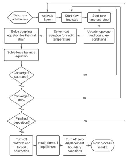 The approach utilized for our development is represented in Figure 4. First, the elements were deactivated except for the platform. Starting from the time step 1, the layers were activated one by one and left for cooling. Simultaneously, after each time sub-step within a time step, the thermal analysis was conducted first according to Equations (1)–(3). Then the thermal result was used to calculate thermal loading using Equation (4), and it was used as input for equilibrium Equations (5)–(6). The time sub-step incremented, and the equations were solved again until the whole step was resolved. After one layer was resolved entirely, the next layer was activated. After all the layers are activated, the platform’s temperature boundary condition is turned off, and it is left for cooling until it reaches equilibrium with the environment. Afterward, the part detachment is performed, and due to the thermal loading and constrained shrinkage, the part warps and deformations are obtained.