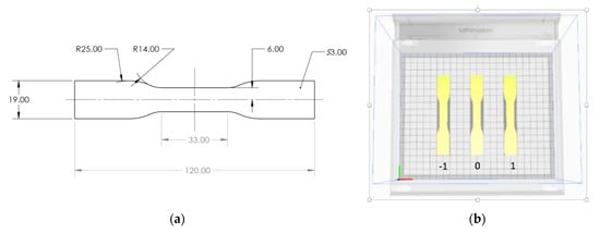 The samples were printed using the Ultimaker S3 printer (Ultimaker B.V., Utrecht, The Netherlands), which has a dual extrusion print head and a nozzle of 0.4 mm diameter. The geometry of the samples is shown in Figure 5. It was sliced in Ultimaker Cura software where extrusion temperature, bed temperature, and layer thickness were set individually for each experimental run according to the Taguchi orthogonal array (Table 2 and Table 3), while other parameters were not changed throughout the experiments and are shown in Table 4. The ABS filaments (Bestfilament”, Tomsk, Russia) were 2.85 mm in diameter. Three samples were printed for each experimental run resulting in 27 samples in total. Depending on the position, three samples were labeled such that the sample in the middle was denoted as “0” and the samples to the left and right of it were labeled “−1” and “1”, respectively (Figure 5b).