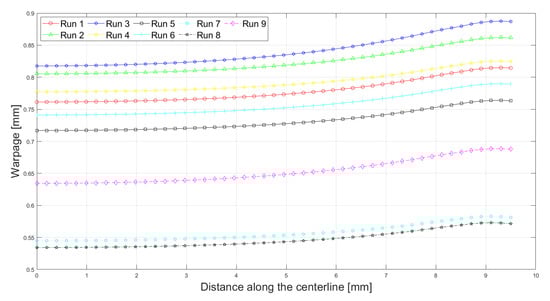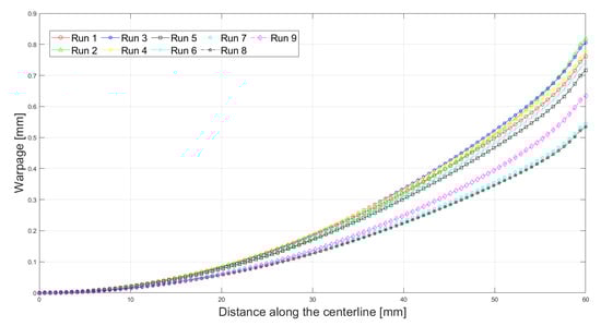 Figure 8 and Figure 9 show the warpage deformation along the central half-length and utmost half-width. It is seen that the warpage progresses along the length and width. At the center of the part, zero warpage is expected, while close to the end it attains maximum value. In addition, warpage along the length increases more compared to the width dimension. Thus, for longer dimensions, the warpage is larger. Similar findings were also observed by [].