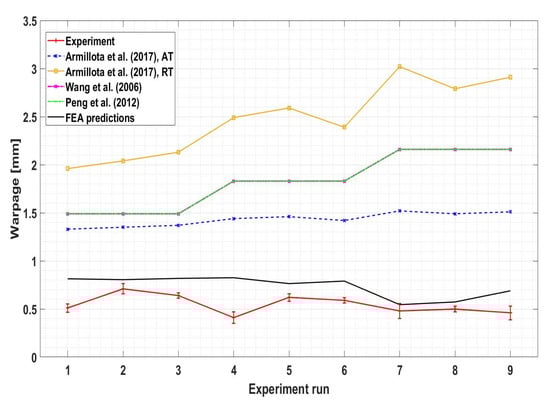 - With regards to the analytical models, all models predicted much higher warping deformation compared to the experimental values and their respective numerical approximations. It was observed that using a model developed by Armillota et al. [], calculated warpage values became more in line with experimental data when the average temperature was used instead of room temperature.