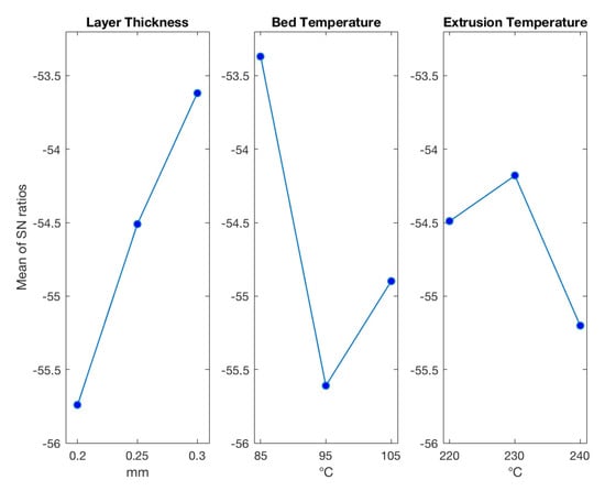 The Taguchi method can help to design experiments to study the effects of process parameters on response parameters. In addition, it allows reducing the number of experimental runs without resorting to complicated calculations. In this study, the process parameters are layer thickness, extrusion, and bed temperature, while warpage was chosen as a response parameter. It is desired to reduce the warping of the samples. Hence, the smaller-is-better approach was used. To analyze the effects of the process parameters on the warpage, the S/N ratios need to be calculated. Equation (7) is used to calculate (S/N ratio) for the smaller-is-better approach in Taguchi analyses, where , , and are variance, average, and target value, respectively. In this study, the target value is 0.