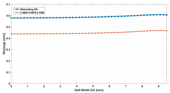 It can be noted that the FEM predicted values for the part warpage are bigger than the corresponding experimental findings. This implies that FEM overestimates the dimensional deviation of FDM printed parts. The same finding was stated in other literature []. The relative percentage error between the numerical and experimental warpage results for alternating and sandwich specimens are 1.4% and 9.5%, respectively (see Table 12). In this study, all the material properties were obtained from the existing literature and therefore might not be the same as the utilized thermoplastics. This can be considered as a feasible reason for the discrepancy between the numerical and experimental results. For example, the warpage prediction using FEM was shown to be linearly dependent on the CTE of the assigned material []. Therefore, the accuracy of numerical simulation in predicting the warpage of FDM printed parts can be enhanced by implementing the exact material properties as an input.