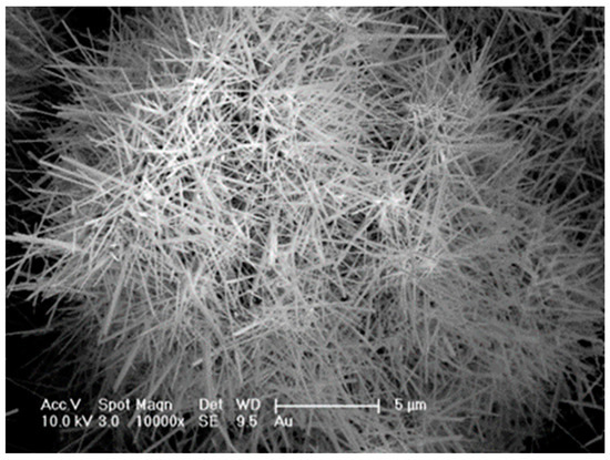 INT-WS2 with diameters between 30 and 150 nm and lengths between 1 and 20 micrometers were synthesized using a published procedure [39]. Briefly, the precursor nanoparticles of tungsten trioxide, grow into high aspect ratio tungsten suboxide nanowhiskers under a mild reducing atmosphere at 840 °C. Subsequent sulfurization of the nanowhiskers results in hollow WS2 nanotubes. A representative SEM image of the typical INT-WS2 is shown in Figure 1.