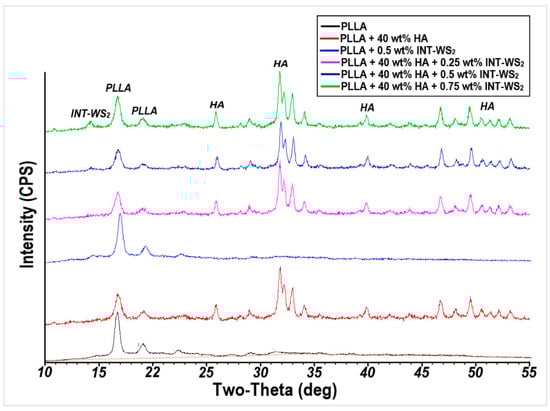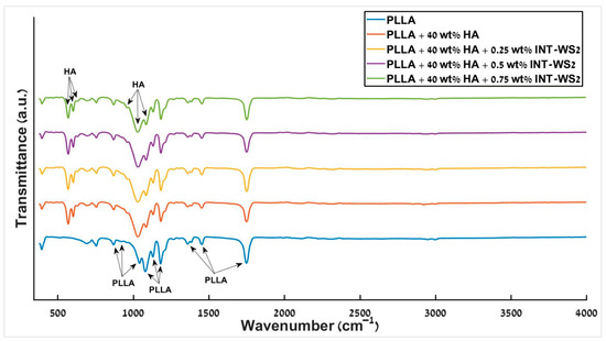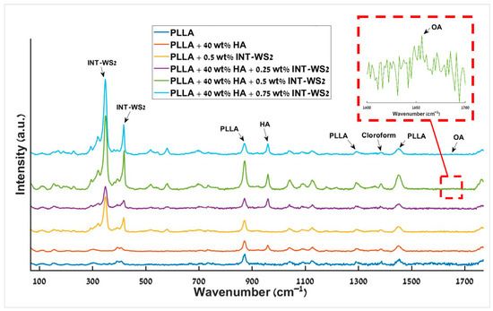 The film of PLLA with 0.5 wt% INT-WS2 and the films of PLLA with 40 wt% HA and 0.25–0.75 wt% INT-WS2 present peaks at 350 cm−1 and 418 cm−1, which are associated with the E2g and A1g modes of the INT-WS2 [69].