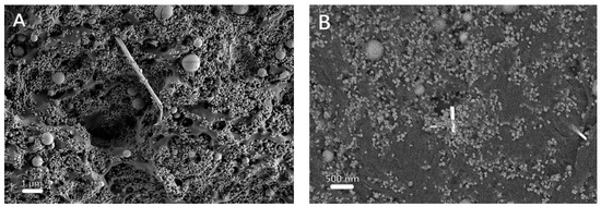 Figure 3B,C show that the HA nanoparticles (NPs) were well dispersed in the polymer matrix. i.e., no phase separation or excessive additional agglomeration was observed, which was not the case in the absence of OA. Furthermore, Figure 3C shows that the HA agglomerates (>0.5 μm) were not damaged during the film breaking process, but were uprooted as a whole from the polymer matrix surface. Furthermore, the hemispherical depressions in Figure 3C (red arrows) appear to be remnants of entire HA agglomerates, which were uprooted from the polymer matrix during fracture, possibly being stuck to the other surface of the broken contact. Consequently, one can conclude that the strain was not well transferred to these agglomerates during fracture, and hence they adversely affected the mechanical strength of the film.