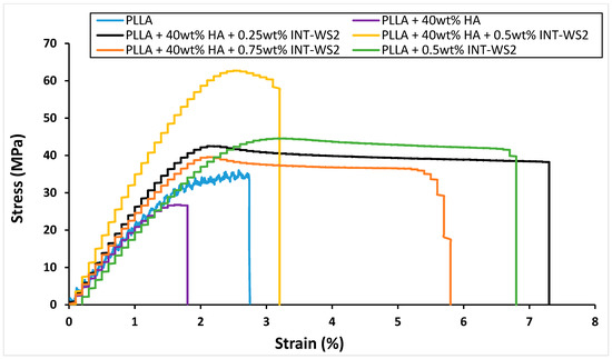 Stress–strain curves of PLLA film and its HA/INT-WS2/PLLA nanocomposites.