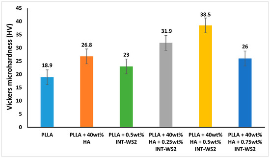 The addition of HA nanoparticles to the PLLA film increased the hardness value (26.8 HV) by 1.4 times compared to the hardness value of the neat PLLA film (18.9 HV). In addition, the hardness of the PLLA film with 0.5 wt% INT-WS2 (23 HV) increased 1.2 times compared to the hardness of the neat PLLA film, with a significance level of p = 0.1 for a two-tailed T-test.
