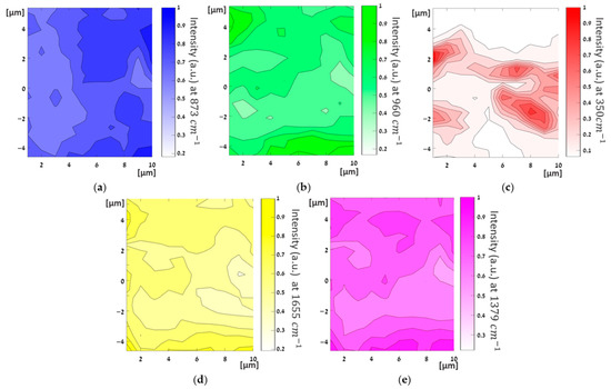 Raman spectroscopy was performed using a Horiba-Jobin Yivon (Lille, France) LabRAM HR Evolution micro-Raman set-up with a 532 nm wavelength, solid-state laser. Both spectral measurements of the samples and the Raman mapping of PLLA film with 40 wt% HA and 0.5 wt% INT-WS2 were carried out using 600 grooves/mm grating, spectral range between 70 and 1700 cm−1, with 30 s for each spectrum. The reported spectra represent the average of two measurements. The Raman spectra were obtained over all composites of PLLA and HA and INT-WS2 film, while the mapping was performed on an area of 10 × 10 µm2 of the PLLA film with 40 wt% HA and 0.5 wt% INT-WS2.