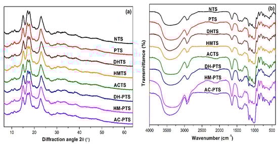 FT-IR spectra represent the stretching, bending, and deformation bands corresponding to the functional groups present in starch granules. The FT-IR spectra of native and modified talipot starches are shown in Figure 2b. A broad peak at 3438 cm−1 illustrates the O–H group stretching vibrations, and the peak noticed at 2927 cm−1 by a stretching vibration shows the presence of the CH2 group []. The peak observed at 1640 cm−1 indicated the H–O–H bending vibration of water molecules found in the amorphous regions. The peaks noticed at 1444 and 989 cm−1 shows CH3 and C–O–H bending vibrations, respectively []. The increased peak intensity of all phosphorylated talipot starches at 1160 and 1010 cm−1 depicts P = O and P–O–C stretching vibrations, respectively. Compared to NTS, the increase in the intensity of these two peaks confirms the phosphorylation reaction with the formation of phosphate crosslinks in the modified starches []. Thermal modification on DHTS, HMTS and ACTS samples did not add a new characteristic peak to the FT-IR spectra; however, noticeable change in peak intensity indicating O–H groups was observed in the thermally modified samples. With thermal pretreatment, the peak intensity depicting P = O and P–O–C stretching vibrations of DH-PTS, HM-PTS, and AC-PTS samples increased compared to PTS, which can be correlated with the increased P content and DC of dual-modified talipot starches.