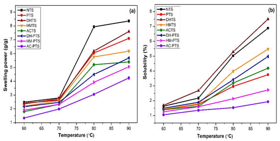 The interaction of the amorphous and crystalline region of the starch chain with water molecules is indicated by swelling power and solubility. The swelling power of native and modified talipot starches increased with the increase in temperature from 60 to 90 °C (Figure 3a). The augmentation in swelling power of starch was caused by the breaking of amylose and amylopectin present in starch granules, which destructs the crystalline regions and causes swelling of starch granules []. The swelling index of single and dual-modified samples decreased significantly (p ≤ 0.05), where the least swelling power was observed in the AC-PTS sample. In the PTS sample, the reduction in swelling power might be attributed to the strengthened intermolecular interaction by the introduction of phosphodiester bonds upon crosslinking. The addition of phosphate groups thus tightly held the starch granules and formed a gelatinized mass that inhibited swelling even at higher temperatures []. Phosphorylated starch from sago and taro also indicated reduced swelling power in previous studies [,].