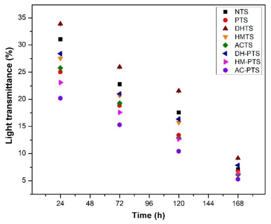 Higher starch paste clarity is an important characteristic in the preparation of certain products such as fruit pastes, jellies, and pie fillings that require transparency, and it is indicated by a higher light transmittance value []. The light transmittance value of native and modified talipot starch samples decreased as the storage period increased due to the turbidity formation in starch gel, as shown in Figure 4. This is because of the reassociation of leached amylose–amylose and amylose–amylopectin chains by retrogradation []. Thermal modification with DHT significantly increased (p ≤ 0.05) and HMT and autoclave treatment significantly decreased (p ≤ 0.05) the light transmittance of talipot starches. The lower light transmittance value of hydrothermally modified starches was attributed to the increase in flexibility of starch chains within the amorphous region of granules []. The process of phosphorylation remarkably decreased the paste clarity of modified talipot starches, except for that of the DH-PTS sample. The light transmittance of PTS, HM-PTS, and AC-PTS was significantly lower (p ≤ 0.05) than NTS. Upon phosphorylation, crosslinks formed after gelatinization changed the granular structure and made them more intact, restricted the light transmittance, and resulted in lower paste clarity []. Moreover, enhanced reassociation of starch chains upon HMT and autoclave treatment caused a reduction in light transmittance. Nevertheless, the light transmittance of DH-PTS was significantly higher (p ≤ 0.05) than PTS, and at the end of 168 h of storage, the light transmittance of DH-PTS showed a significant increase (p ≤ 0.05) compared to NTS. The augmentation in the paste clarity by pretreatment with DHT can be ascribed to the reduction in the amount of swollen starch granules followed by the gelling and fragmentation of amylopectin fractions. The double-helical structure and interaction of starch molecules were weakened upon DHT compared to native starch granules []. This induced molecules to be more dispersive and contributed to increasing paste clarity in the DH-PTS sample. Dry-heat-treated maize and sweet potato starches showed a consistent increase in light transmittance in earlier reported studies [,].