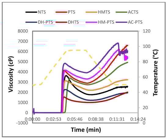 Peak viscosity (PV) is the maximum viscosity shown at the equilibrium point between swelling and polymer leaching due to increased temperature, and break down viscosity (BDV) represents the starch granules’ stability against shear force and temperature. The PV and BDV of NTS were observed to be 3646 and 1881 cP. The PV of PTS, HMTS, ACTS, HM-PTS and AC-PTS showed a significant increase (p ≤ 0.05), whereas the DHTS and DH-PTS showed a significant decrease (p ≤ 0.05) compared to NTS. The increase in PV of PTS is due to the higher integration of starch granules. Modification of starch by phosphorylation enhanced the resistance of granules against disintegration by increasing the intra- and inter-bonding between starch molecules, which resulted in higher viscosity []. The PV of PTS was negatively correlated with its swelling power and solubility. This increased viscosity of HM-PTS and AC-PTS was ascribed to the increase in the starch granule rigidity upon hydrothermal treatments and crosslinking []. Besides, the reduction in PV of DHTS and DH-PTS could be attributed to the increased association between starch chains by the increase in the intra-granular bonding force []. Lower PV and BDV of DH-PTS indicate stronger paste characteristics by the enhanced shear and heat stability of the starch granules.