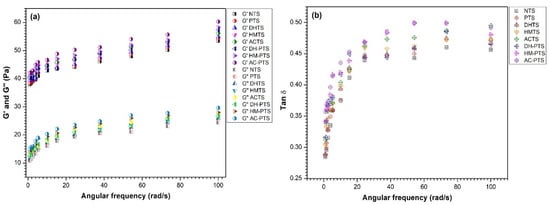 The rheological properties dictate the flow and deformation behavior of starch under stress. The rheological properties of the starch gels are crucial to determine the processability and eating quality of starch-based food products. The G′ and G″ of native and modified talipot starch samples over an angular frequency (ω) of 1–100 rad/s are depicted in Figure 6a. G′ indicates the elastic nature of the starch gel, and it is the amount of energy recovered after each deformation cycle, while Gʺ represents the viscous nature of the starch gel, and it is the amount of energy lost as viscous dissipation after each deformation cycle []. Native and all modified samples exhibited G′ > G″ upon rheological analysis, revealing the elastic property of the starch. Among the modified starches, AT-PTS showed the highest G′ and G″ values. Upon modification, the G′ and G″ increased due to the increased crosslinking between the starch chains and facilitated the development of junction zones in the continuous phase of starch gels. This results in an augmentation in the gel strength after phosphorylation. In HMTS and ACTS samples, the increased G′ was ascribed to the enhanced retrogradation tendency by hydrothermal treatments, which aids in increased bonding between amylose and amylopectin. Besides, pretreatment with DHT, HMT, and autoclaving increased firmness and gel strength []. Compared to NTS, all phosphorylated talipot starch gels showed higher paste stability and formed stronger gels resistant to excessive heat and shear due to decreased amylose content and swelling power. Similarly, Li et al. [], in their work, stated that the gel formation of waxy rice starch was enhanced with the addition of xanthan along with DHT. Hence, in our study with phosphorylation, the association formed between phosphate groups and starch made stronger gels that are stable to shearing and heating. Such starch pastes or gels that require higher energy for sheeting or rolling are suitable for the preparation of flattened bread, pasta and noodles [].