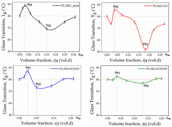 Table 3 shows the values of φb, φt and φv obtained as a result of an approximation of the dependent G″(T) experimental curves, over the entire concentration range for PU/sic_neat and PU/SiC@C/NW samples.