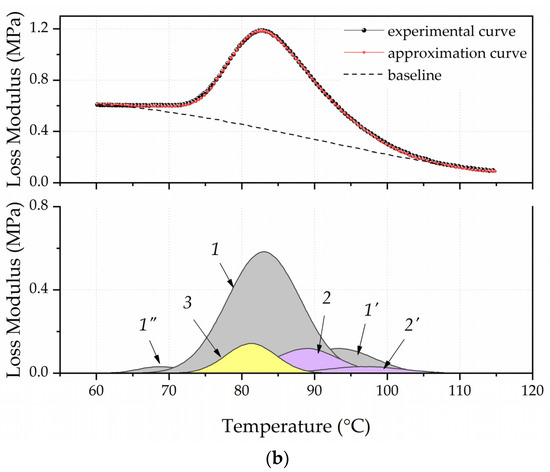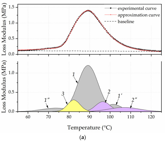 The asymmetric and wide peak of the mechanical loss modulus on temperature dependence for unfilled polyurethane was a superposition of peaks (Figure 4). They reflected the temperature transition to a flexible segments’ highly elastic state that contained an ester group and rigid segments, which contained a urethane group characterized by a different molecular mobility. It was shown in articles [31,32] that the asymmetric peaks of E″ or tan(δ) must be graphically decomposed to identify all types of polymer chain segmental movement that made up a common peak.