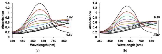PEDOT films obtained in the mixtures of polyacids (even at twice higher content of the flexible-chain polyacid) (Figure 6e,g) demonstrate behavior similar to that of PEDOT–t-PASA film: the maximum of the absorption bands of the reduced (~550 nm) and polaronic (~770 nm) forms of PEDOT and the i.p.1 (650–670 nm) are shifted to the short-wave region and are located in the position between those for the films of complexes with rigid-chain and flexible-chain polyacids. It is characteristic that the isosbestic point in this case exists in the whole range of studied potentials, indicating preferential conversion of the neutral form of PEDOT to the polaronic one, and, to a much lesser extent, to the bipolaronic one. Thus, PEDOT–polyacid mixture films demonstrate retarded formation of bipolarons as PEDOT–t-PASA, but have longer conjugation.