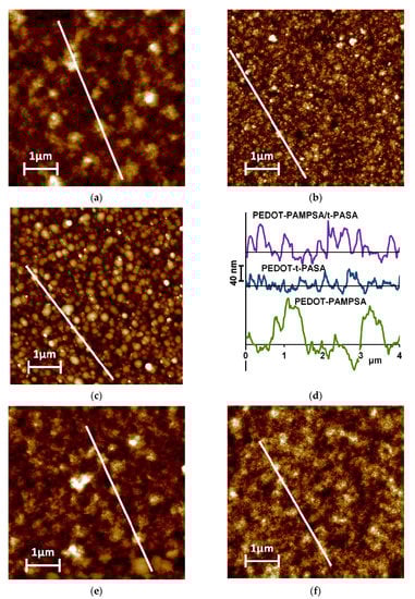 Films of PEDOT, obtained in the presence of PEs, were also characterized using the AFM method. Figure 7 shows that films with greater roughness formed by larger objects are obtained during the synthesis of PEDOT in the presence of PAMPSA, PAMPSNa and, to a lesser extent, in the mixtures of polyacids and polysalts. PEDOT films obtained in the presence of PAMPSA and salt forms of PEs and their mixtures reveal filament-like structures. The surface of the films of PEDOT with t-PASA and 1:1 mixture of the polyacids consists of isolated globules with a size of 150–400 nm.