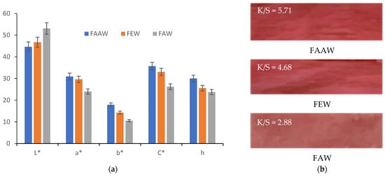 - In terms of color strength, wool functionalization is better because the FAAW sample has K/S = 5.71 higher than the FAAD sample (K/S = 5.6). The lightness values indicate the same idea: L* = 44.62 in the case of FAAW and L* = 46.27 in the case of FAAD. However, obtaining the FAAW requires increased attention to the handling of the protonated wool, from the functionalization bath to the dyeing bath;
