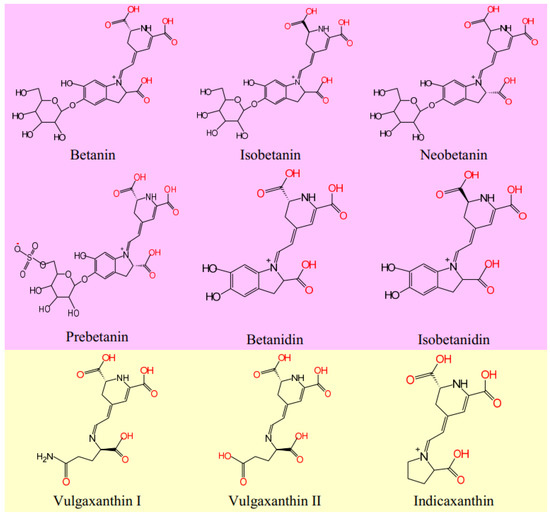 | Betacyanins (Red–violet color) | Betanin | 3 | 5 | - | - | 1.46 | −3.6 | 0.5 |