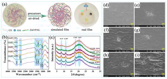 The simulation process of films (the digital photo of the real film was taken by overlaying the film on a photo of cartoon character we drew by ourselves) (a), ATR-FTIR spectra of CG and CGZP films (b), XRD patterns of CG and CGZP films (c), SEM micrograph of the cross-section of CG (d), CGZP−0.25% (e), CGZP−0.5% (f), CGZP−1.0% (g), CGZP−2.5% (h), and CGZP−5.0% (i) films with a magnification of 10,000.