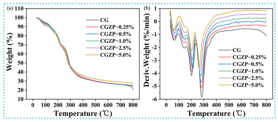 TG curves (a) and DTG curves (b) of CG and CGZP films.