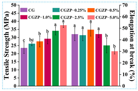 Tensile strength and Elongation at break of CG and CGZP films. Different letters in the columns indicate significant difference (p < 0.05).
