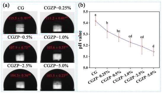 WCA (a) and pH (b) value of CG and CGZP films. Different letters in each figure indicate significant differences (p < 0.05).