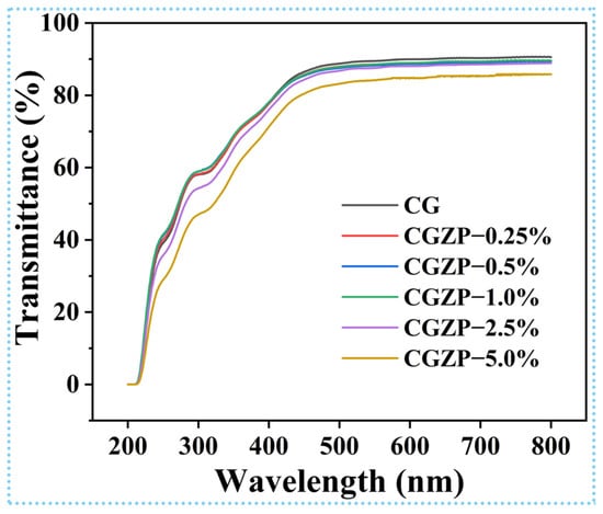 The optical property of the wound dressings is a significant element in real-time monitoring of the change of wounds [68]. The light transmittance spectra of CG and CGZP films are presented in Figure 5, where CG film has the highest light transmittance of 91% at 800 nm, and as predicted, the light transmittance of the films decreased slightly with the increased content of ZnO/PAL nanorods, and finally dropped to 86% in CGZP−5.0% film. A higher concentration of ZnO/PAL increased the opacity of CGZP films, which might be attributed to the existence of ZnO/PAL that may block light from traversing the film in the form of scattering, especially when nanorods are evenly decentralized in the polymer matrix [69]. Furthermore, the thickness may also affect the opacity of the films, although the differences between them are not significant (p > 0.05), as revealed in Table 2.