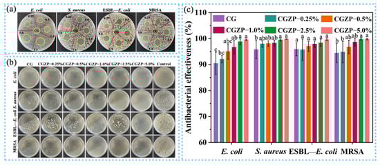 Photographs of inhibitory zones (a) and bacterial colonies (b) of CG and CGZP films against E. coli, S. aureus, ESBL—E. coli, and MRSA, (c) quantitative statistics of antibacterial effectiveness of colony counting method, and different letters in the columns indicate significant differences (p < 0.05).