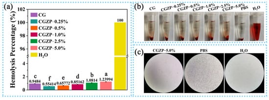 (a) Hemolysis Percentage of CG and CGZP films, and different letters in the columns indicate significant difference (p < 0.05), (b) photographs of centrifuge tubes by disposing of RBCs with different films, PBS, and water, (c) microscope images of CGZP−5.0% film and the controls treated with RBCs.