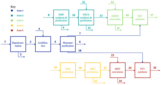 Expanded block flow diagram of the plastic biorefinery concept. Area 1: PET depolymerisation and purification of monomers, Area 2: FDCA production from cellulose, (3) PEF synthesis, (4) PDO production from crude glycerol, and (5) PTT synthesis.