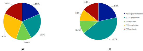 Distribution of capital costs (a) and operating costs (b) between the process Areas of Scenario 1. PET depolymerization = Area 1; FDCA production = Area 2; PEF synthesis = Area 3; PDO production = Area 4; PTT synthesis = Area 5.
